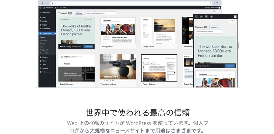 WordPress (ワードプレス)は、WEB上の40%のサイトでつかわれているほど、世界中で圧倒的に支持されています。個人ブログから大規模なニュースサイトまで様々な用途に対応できるツールにアクセスができることが最大の魅力です。